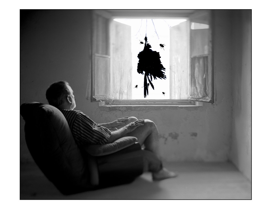 Technique : la photo cadre principale est une prise de vue en argentique en grand format (4’’x5’’, chambre Linhof Technika Objectif Fujinon W 135mm f5.6, plan-film Ilford HP5 plus ISO400 exposé et développé dans du X-Tol en ISO200). Post-production (Lightroom et Photoshop 2025): incrustation d’une photo prise en argentique diapo (oiseau mort) et de photos numériques (les mouches) et colorisation partielle de la base en noir et blanc.