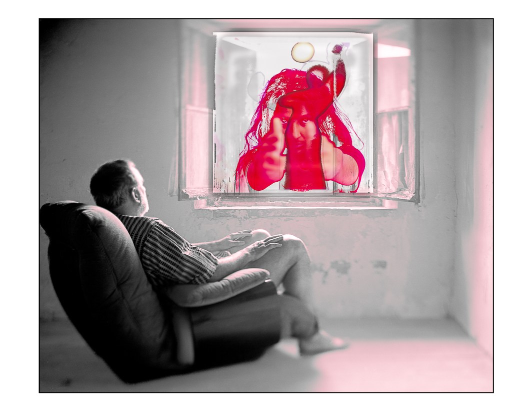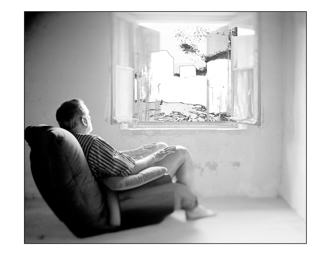 Technique : la photo cadre principale est une prise de vue en argentique en grand format (4’’x5’’, chambre Linhof Technika Objectif Fujinon W 135mm f5.6, plan-film Ilford HP5 plus ISO400 exposé et développé dans du X-Tol en ISO200). Post-production (Lightroom et Photoshop 2025): incrustation d’une photo prise en argentique (le château de Puivert) avec inversion des tonalités et d’une photo numérique au travers d’une moustiquaire pour donner de la texture.