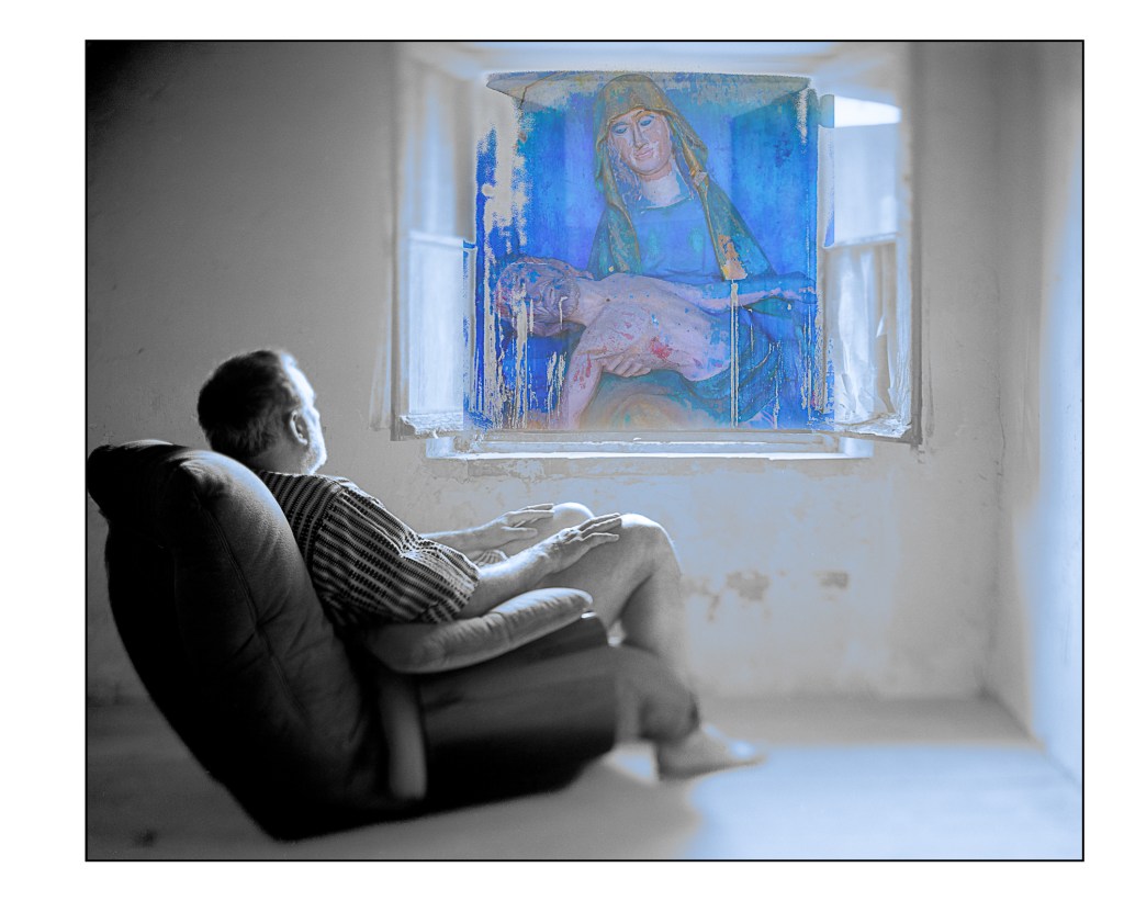 Technique : la photo cadre principale est une prise de vue en argentique en grand format (4’’x5’’, chambre Linhof Technika Objectif Fujinon W 135mm f5.6, plan-film Ilford HP5 plus ISO400 exposé et développé dans du X-Tol en ISO200). Post-production (Lightroom et Photoshop 2025): incrustation d’une photo numérique de La Vierge de Pitié, à côté de la chapelle du Calvaire).